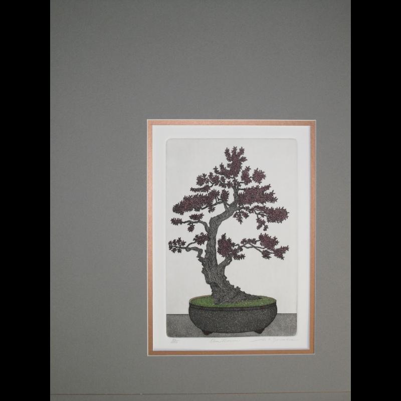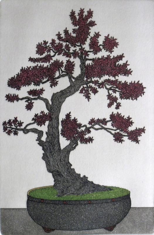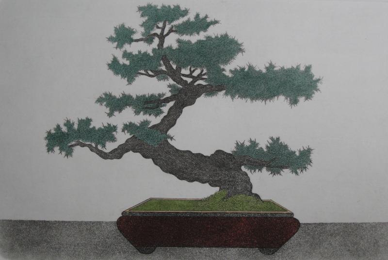 Cultivated, studied and contemplated for centuries, the bonsai tree has become emblematic of a special symbiosis between man and nature. Through the careful practice of zen techniques, a certain degree of refinement is conferred upon both the tree and the master. Please enjoy the bonsai trees shown below. Each has evolved organically, and are indicative of varied styles of cultivation, from the informal upright "Moyogi" to the semi-cascade "Han Kengai". Just as the studied hand of the bonsai master guides the growth of his charges, so does the practiced hand of the printmaker create his images.