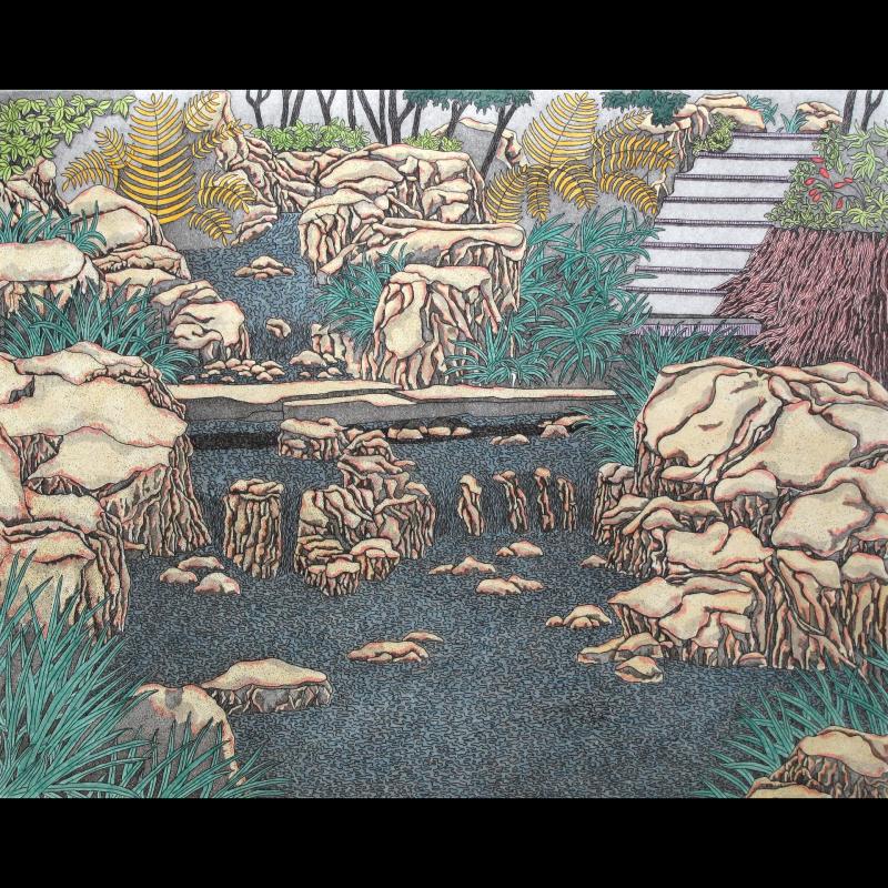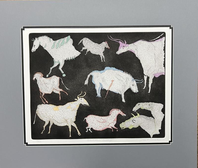 | Original (hand-pulled) water-colored etching. Double matted(SEE THE MAT COLORS IN THE STUDIO ART GALLERY) Framed with contrast grey metal frame and conservation 99% UV glass. |