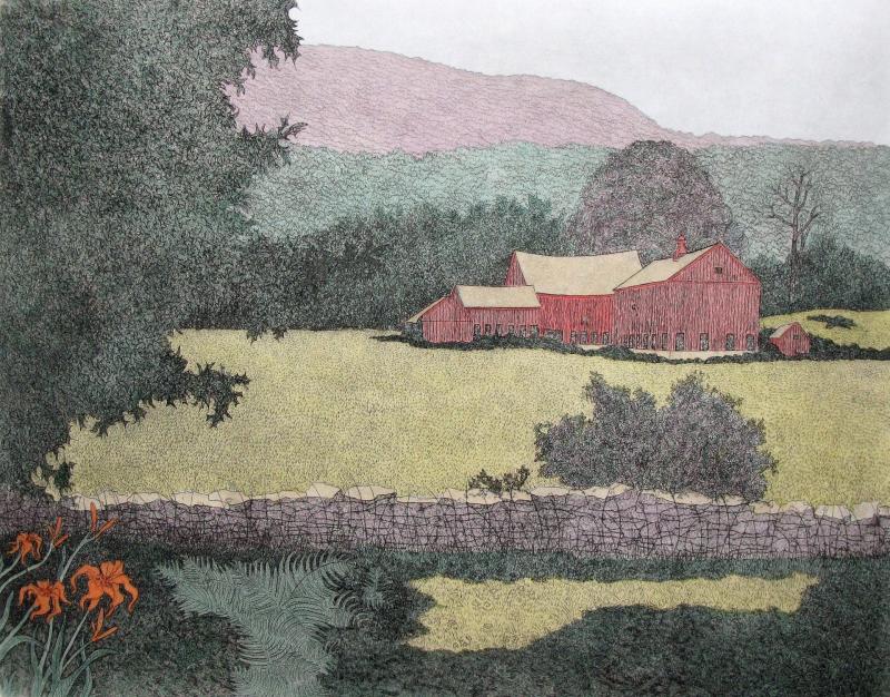 | Original (hand-pulled) water-colored etching. Double matted with Cadet Blue on top and a cuff of Olive. Framed with a contrast grey metal frame, and conservation 99% UV glass. "This is the Poet, William Cullen Bryant Barn, in Cumming ,MA. I exhibited on the grounds many time, in the Berkshires." |