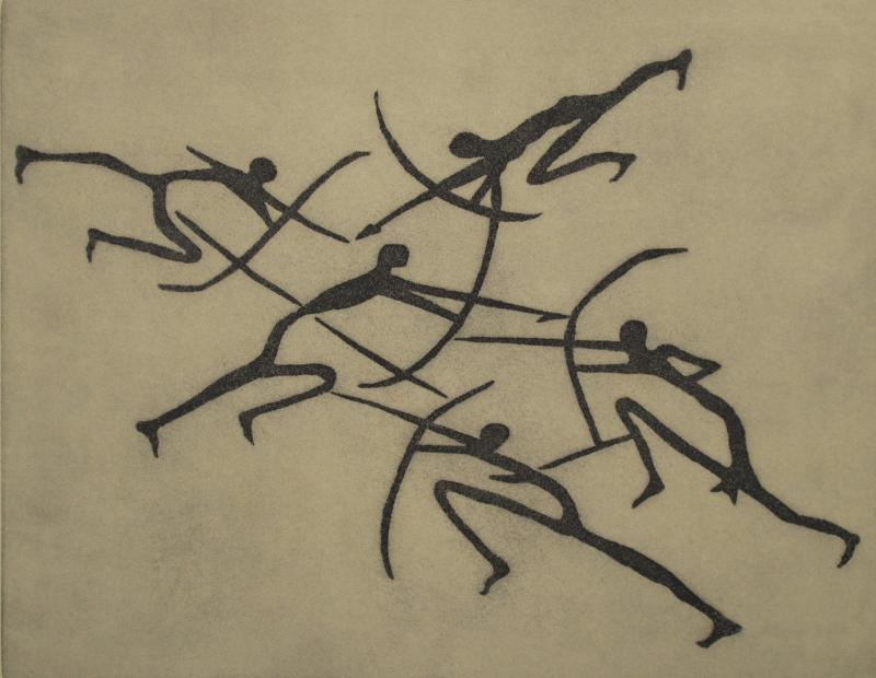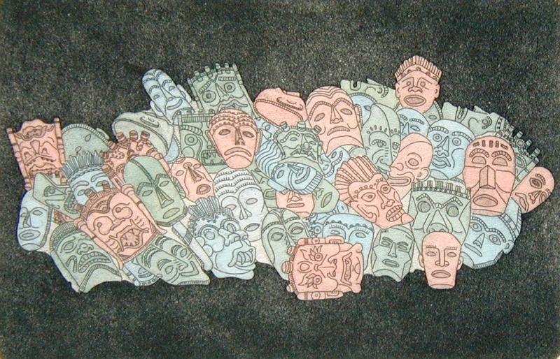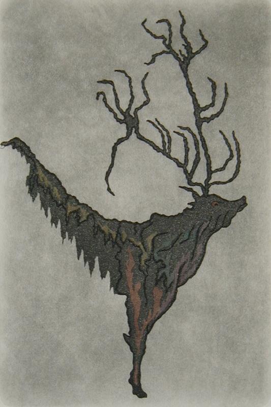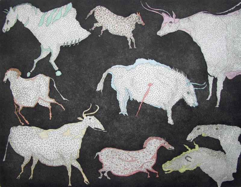 Original (hand-pulled) water-colored etching. Matted (OFF-SET) for design. "I was inspired by the Cave Painting and Etch Carving I saw in Perigord, France, many years ago". Before the discovery of paper we drew our art on cave walls. ~ Leoism |