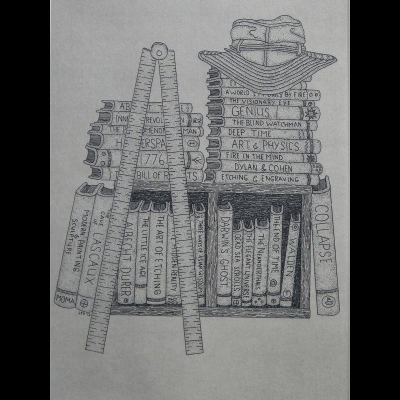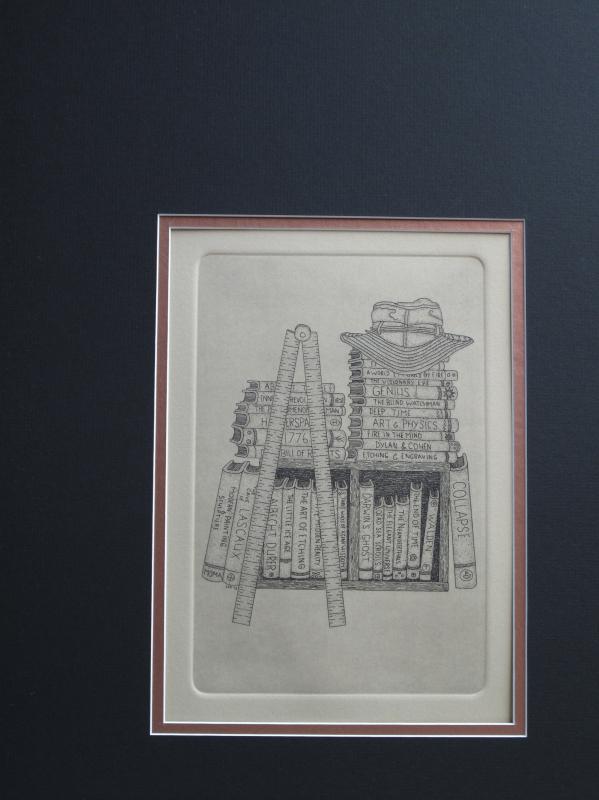 | Original (hand-pulled) Sepia Etching. Matted (OFF-SET) for design. Top mat is Black with a cuff of Gold. framed with a contrast grey metal frame. "A still life of some, of the books, that change me over time". |