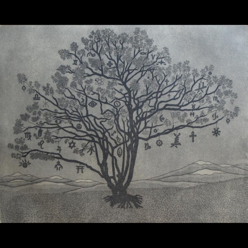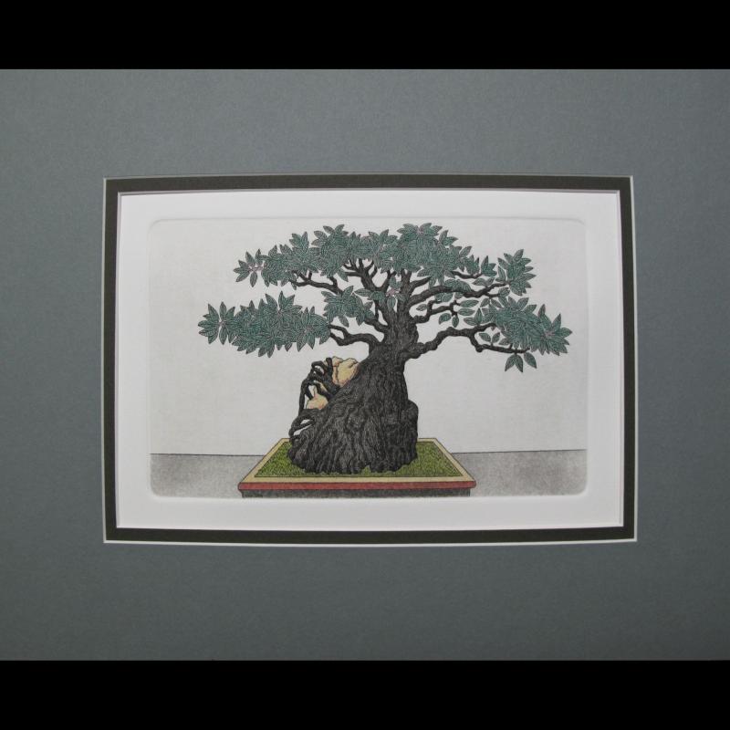 | Original (hand-pulled) water colored etching. Triple matted with cut corners. (SEE THE MAT COLORS IN THE STUDIO ART GALLERY). Framed with 1.3/4" Walnut Olive Stria inlay wood frame and conservation 99% UV glass. WITH NAMES IN THE BRANCHES |