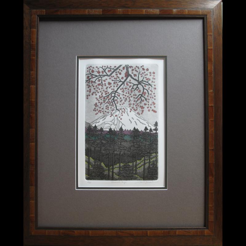 | Original (hand-pulled) water-colored etching. Triple matted with cut corners, Top mat Taupe, middle mat Olive, bottom mat Burgundy.(SEE THE MAT COLORS IN THE STUDIO ART GALLERY). Framed with 1.3/4" Walnut Olive Stria inlay wood frame and conservation 99% UV glass. |