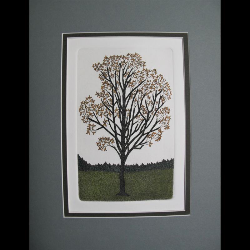 | Original etching Hand pulled and water colored. Double matted Cadet grey top and olive cuff. |