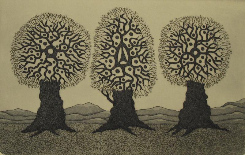 | Original (Hand-pulled) Etching. Printed of Tan 100% rag paper. Double matted with Sahara top and copper cuff. Framed with a contrast grey metal frame. "The Exotrees came about when I began reading about Exoplanets that were being discovered, and imagined what kind of trees would grow on them." |