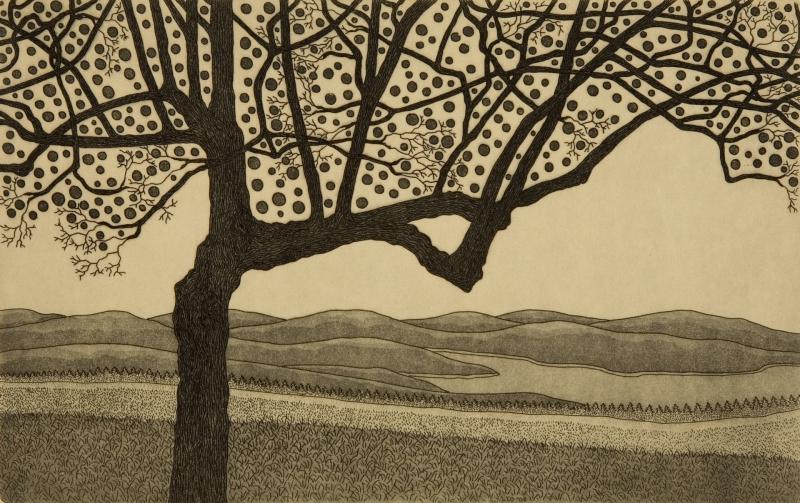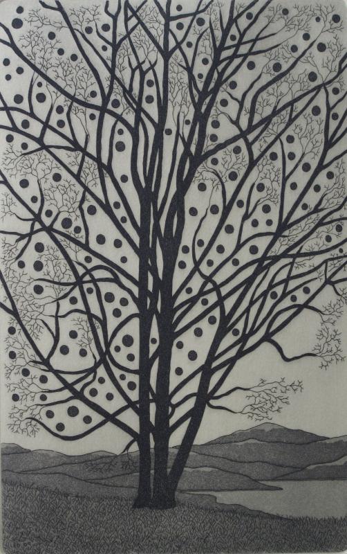 | Original etching. This image was drawn from a branch of our Asian pear tree, in the yard. |