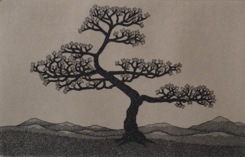| Original (hand-pulled) Sepia Etching. Double matted (SEE THE MAT COLORS IN THE STUDIO ART GALLERY). Framed with a contrast grey frame. "I saw this tree at the (Bahai Lotus Temple) in India" the peace tree.. |