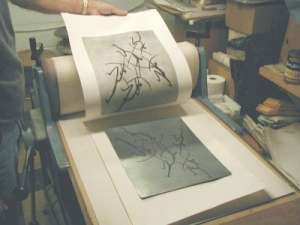 The plate is then submerged in a special acid solution, which bites the image into the zinc surface. The acid can only bite the plate in the areas where the protective ground has been removed, thus etching the desired image into the metal. This part of the process may take several days to several weeks, depending on the intricacy of the image involved.